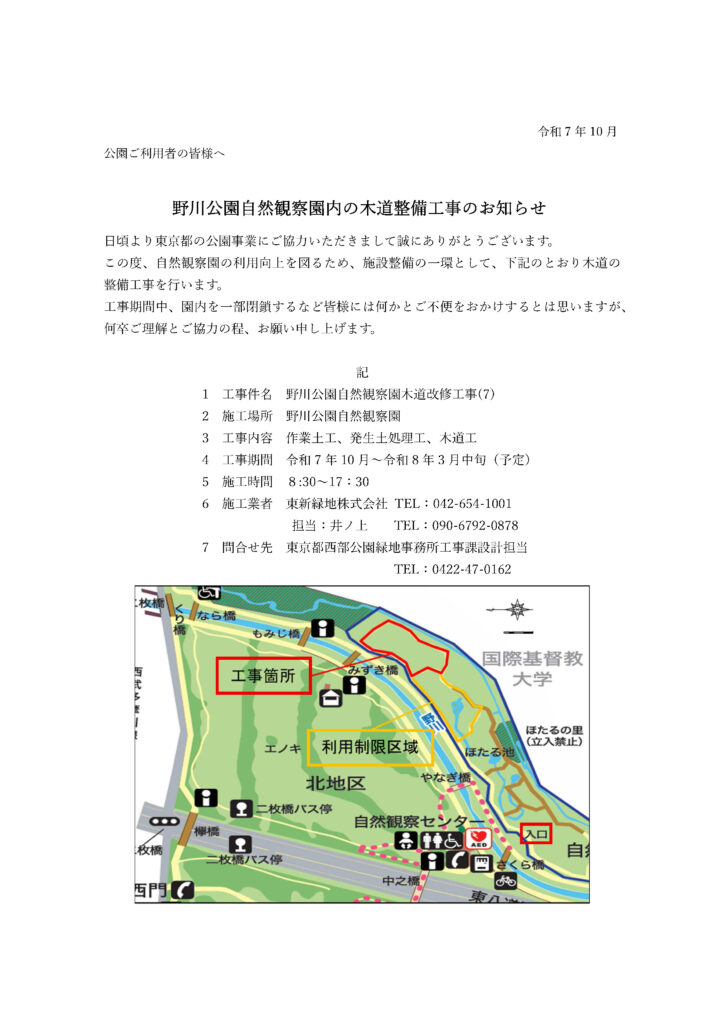 【野川公園】⾃然観察園内の⽊道整備⼯事のお知らせ