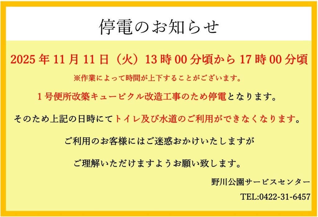 【野川公園】11/11(火)工事に伴う停電のお知らせ