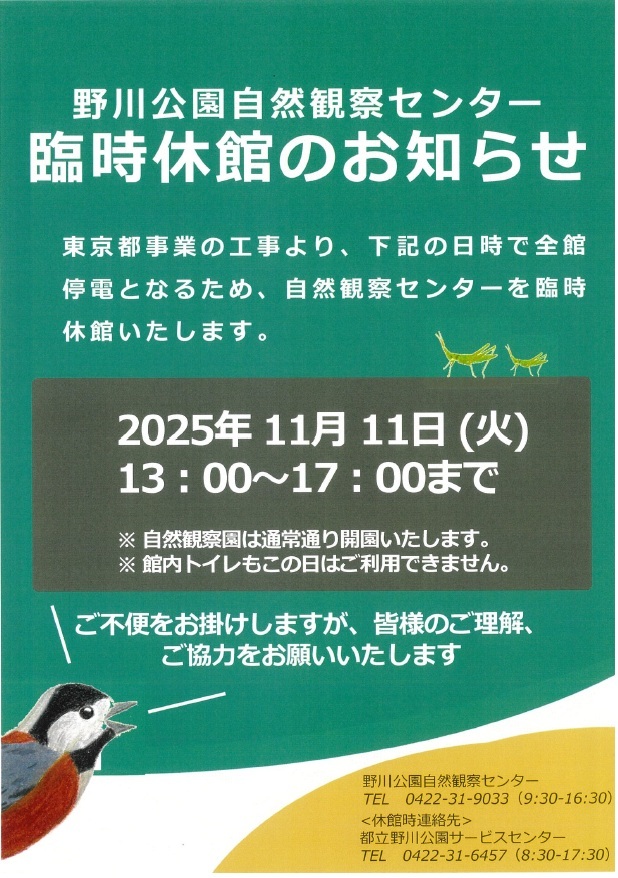 【野川公園】11/11(火)PM 自然観察センター臨時休館のお知らせ