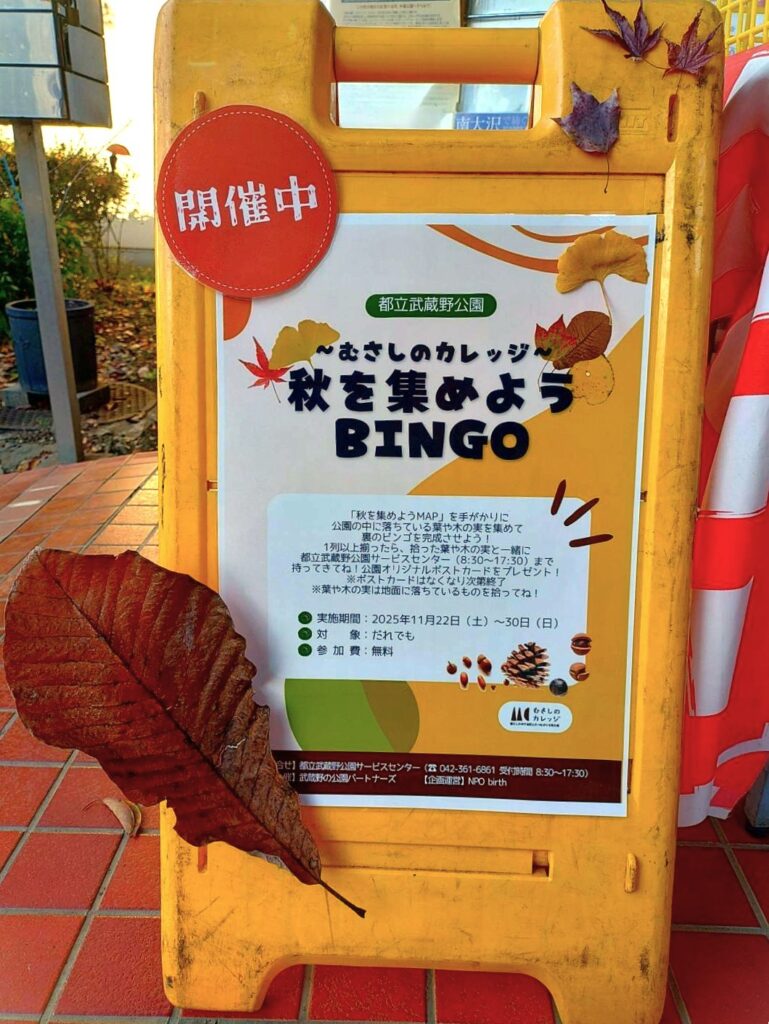 11/22(土)~11/30(日)の期間中、武蔵野公園サービスセンターにて「むさしのカレッジ 秋を集めようBINGO 」を開催します!