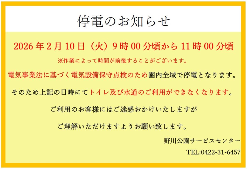 【野川公園】2/10(火)電気設備保守点検に伴う停電のお知らせ
