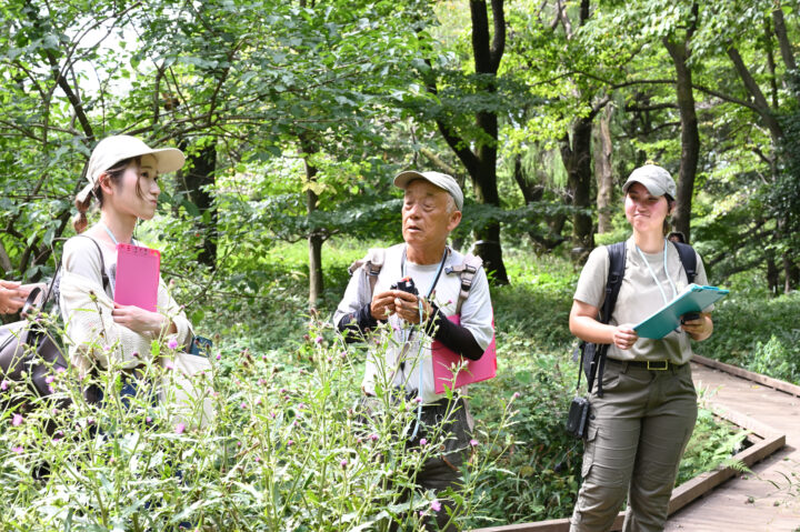 ↑愛護ボランティアの会代表世話人・柴田直樹氏(中央)に活動内容を伺いながら都立野川公園自然観察園を散策