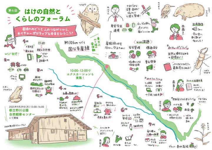 新しくなった自然観察センターは、単なる建物のリニューアルにとどまらず、国分寺崖線をめぐる人や活動をつなぐ「連携の拠点」として、新たな役割を担い始めています。今回のフォーラムのテーマである「崖線緑地のネットワーキング」は、その第一歩となるものでした。